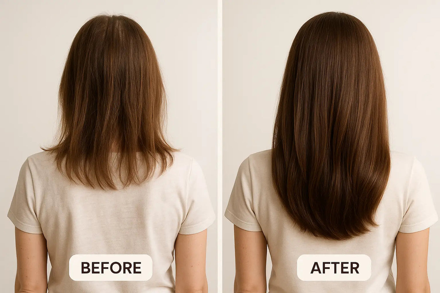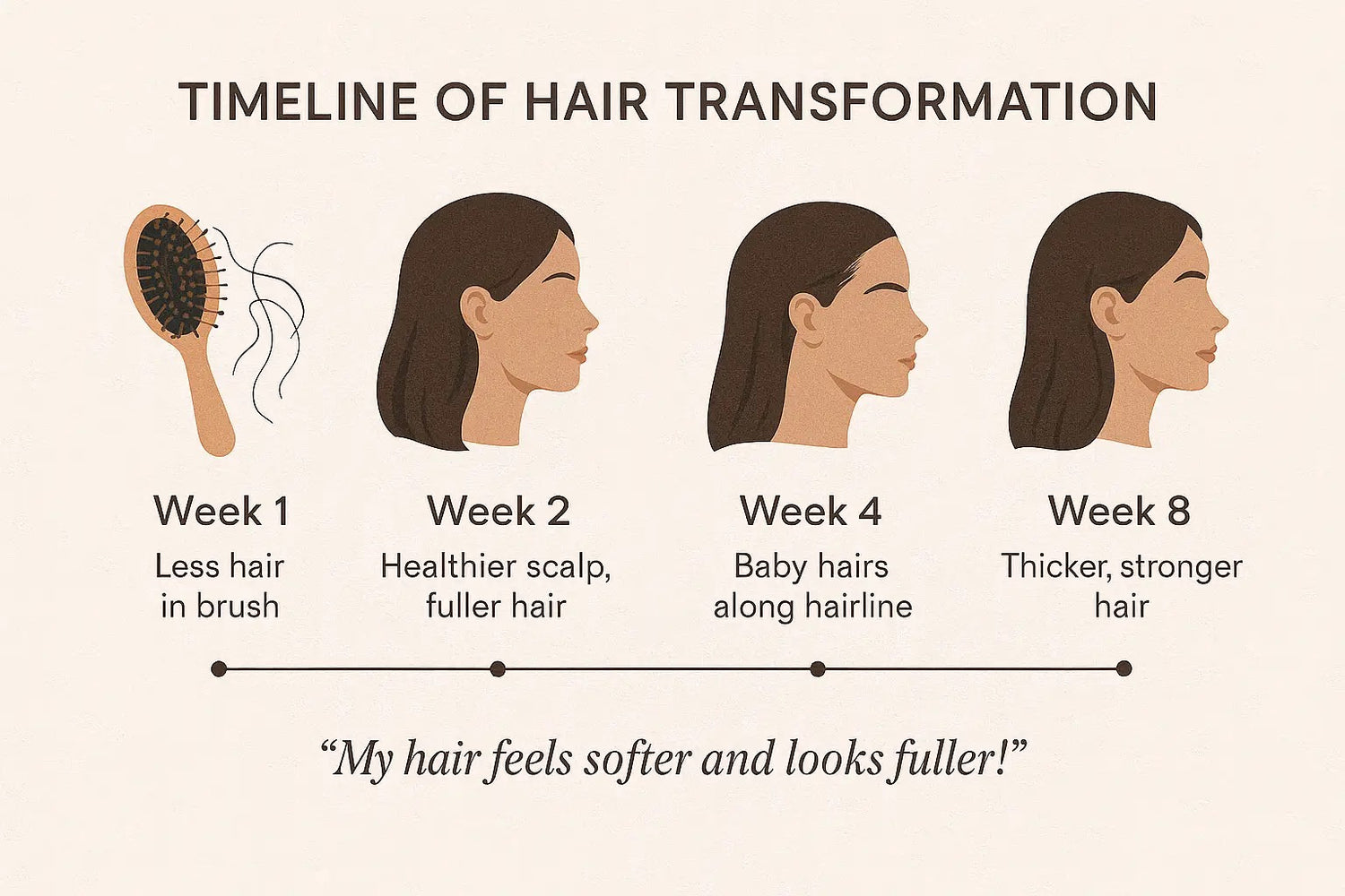 Many users notice less shedding in 2–4 weeks, softer, fuller hair by 4–8 weeks, and visible baby hairs or thicker ponytails by 8–12 weeks. Consistent use is key, and our 30 day guarantee lets you try risk-free.